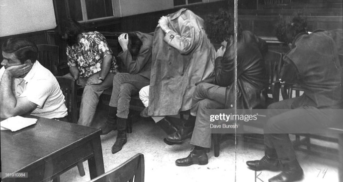 OCT 1967, OCT 22 1967; Detective John Gray, Left, One of Arresting Officers, Waits With Members of Hippie Band; The suspects were arrested for investigation of possession of narcotics and conspiracy to posses narcotics.; (Photo By Dave Buresh/The Denver Post via Getty Images)NOV 4 1967; Denver’s Hippie Community Turned Out in Force to Hear Court Showdown over Barring Officer from Club; More than 100 spectators jammed the courtroom of Denver Dist. Judge John Brooks Jr. to lend moral support to representatives of Family Dog.; (Photo By Dave Mathias/The Denver Post via Getty Images)